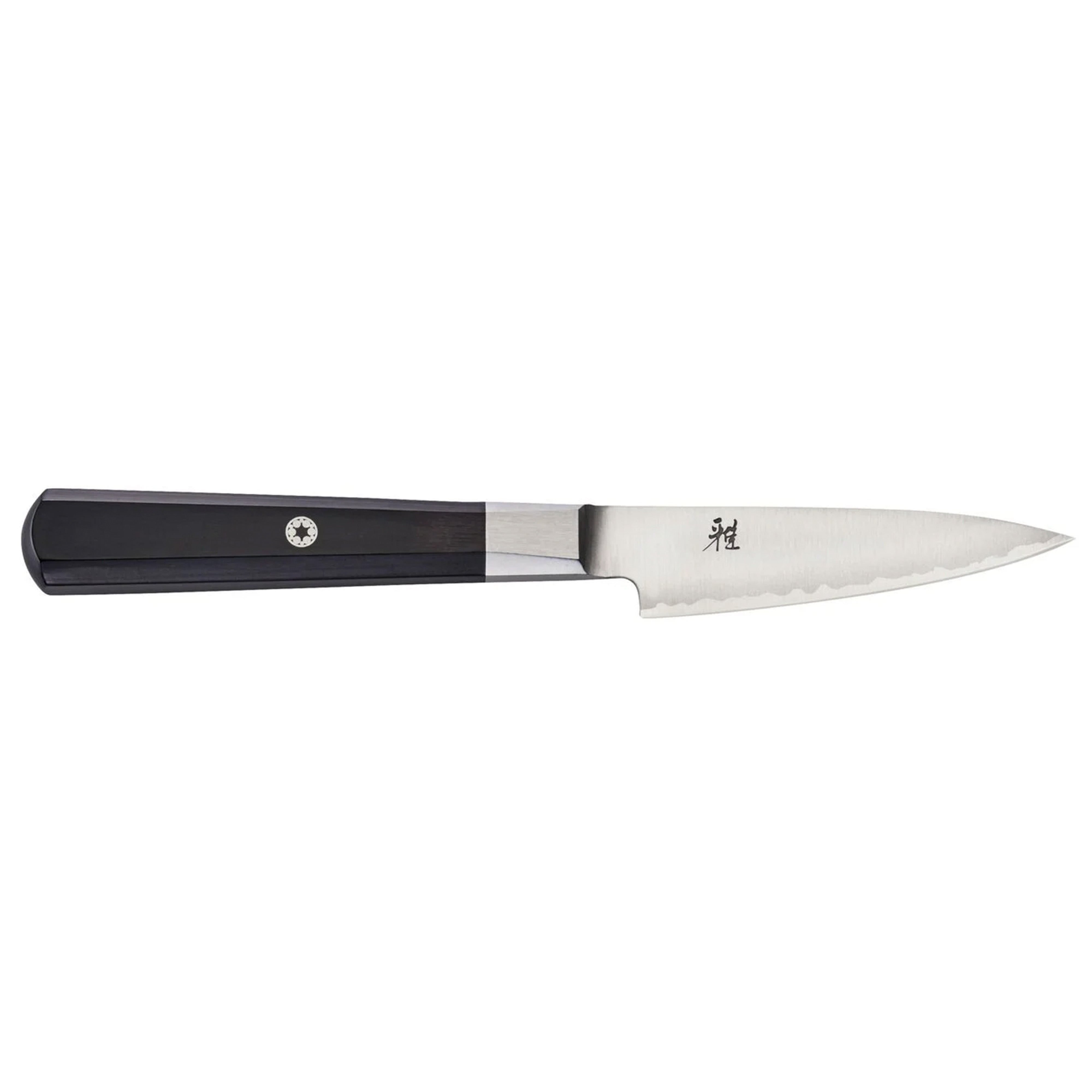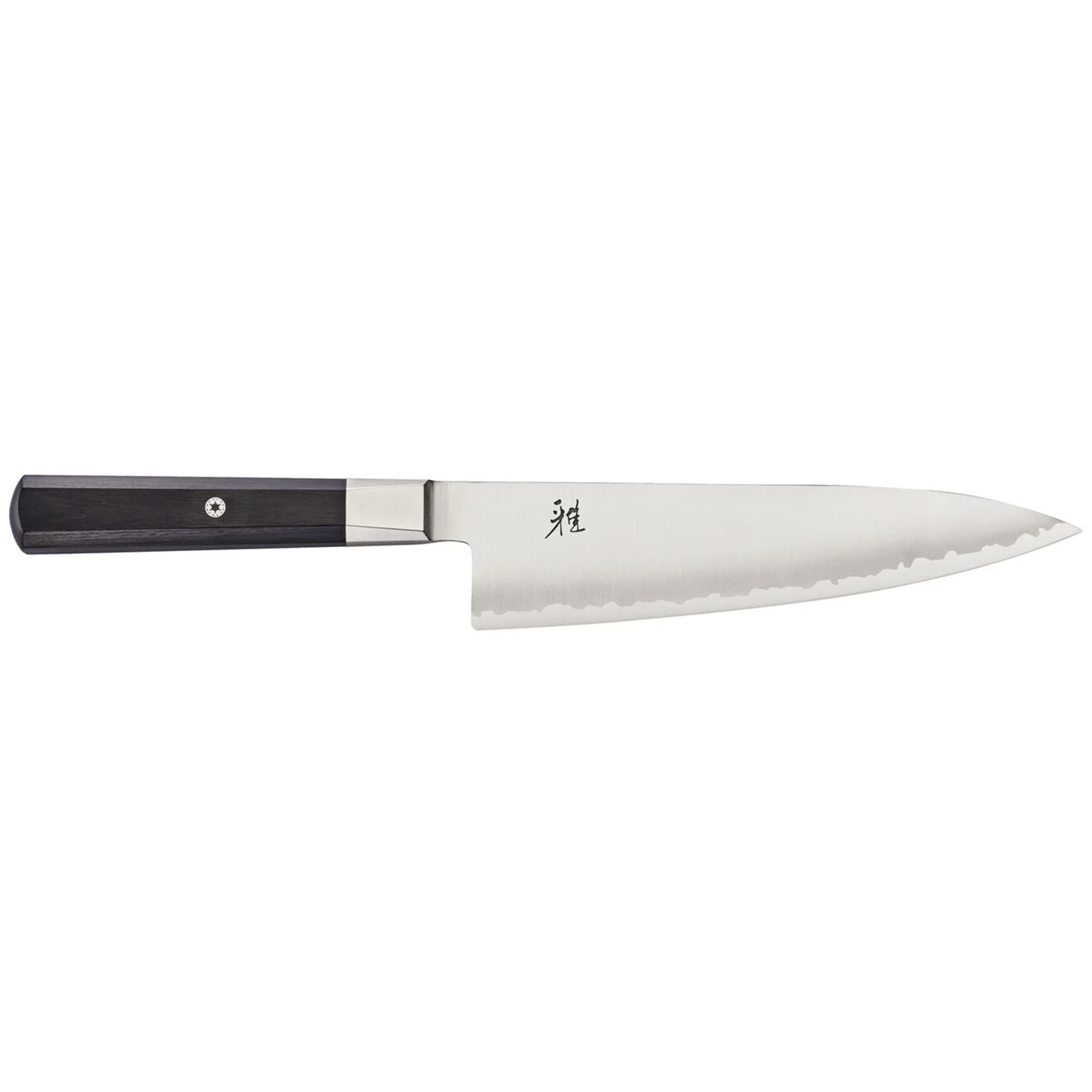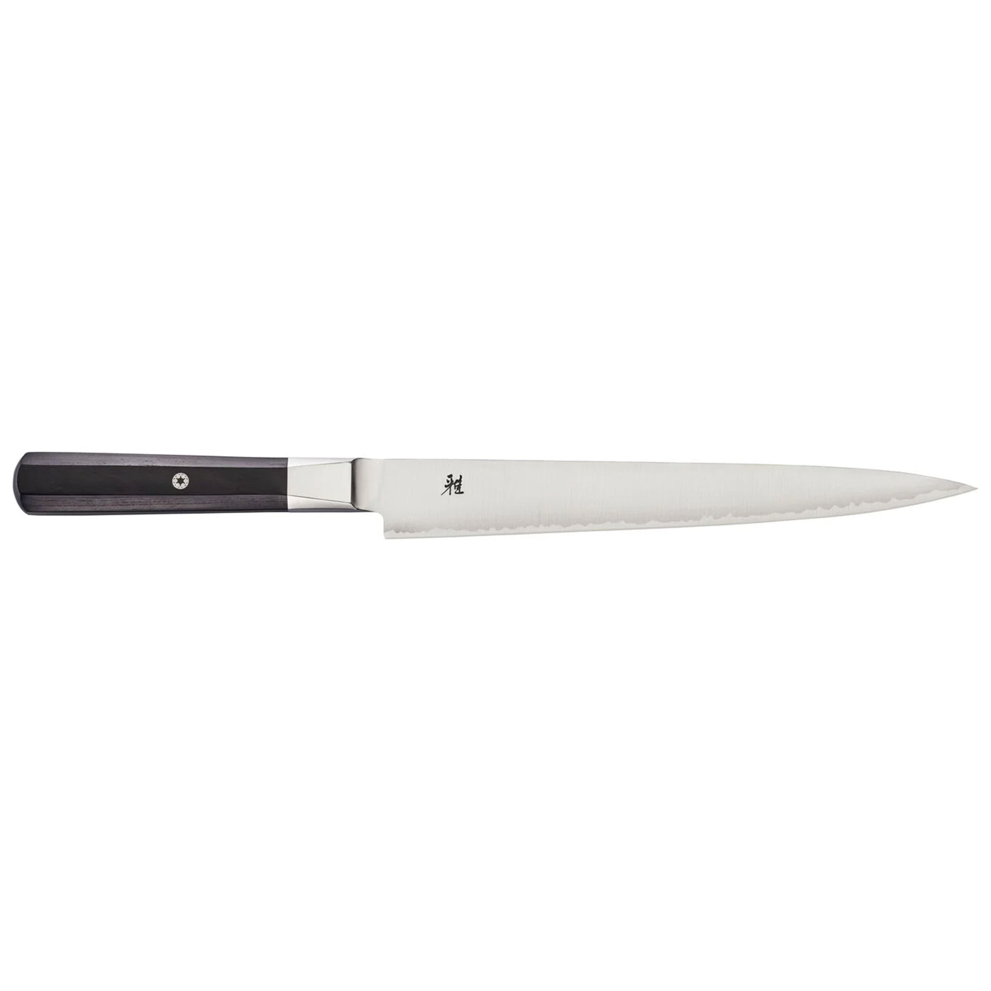 - Mirror-polished blade features Japanese design details: sandblasted katana edge and embossed MIYABI logo