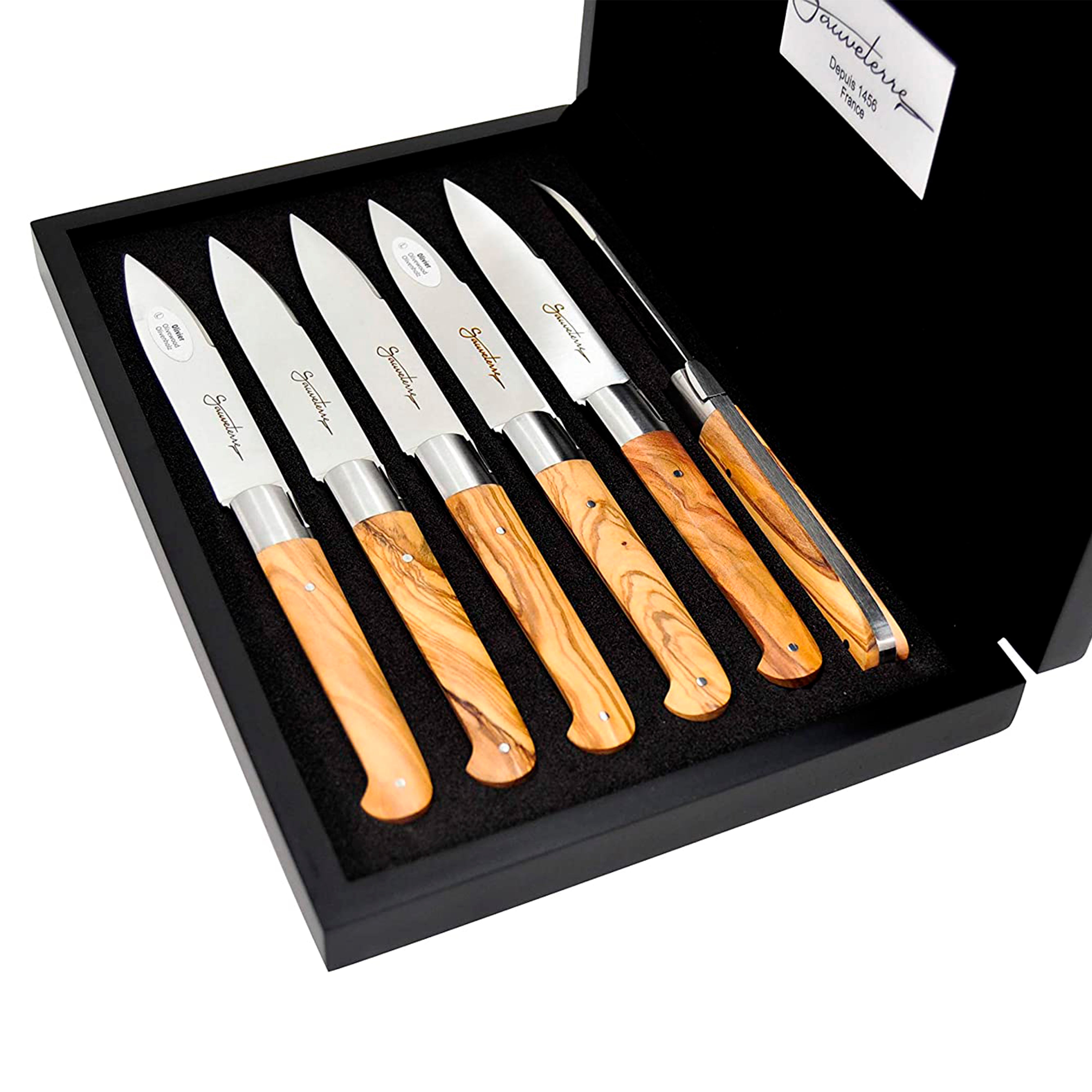 It is a set of six French steak knives with a beautiful traditional design and has solid horn handles. Its blades are made of high-performance stainless steel, which is why they are ideal for cutting due to its great edge. They are delicately handcrafted knives with French artisans from the region and are considered very elegant as a work of art thanks to their balance. They come in a beautiful box.