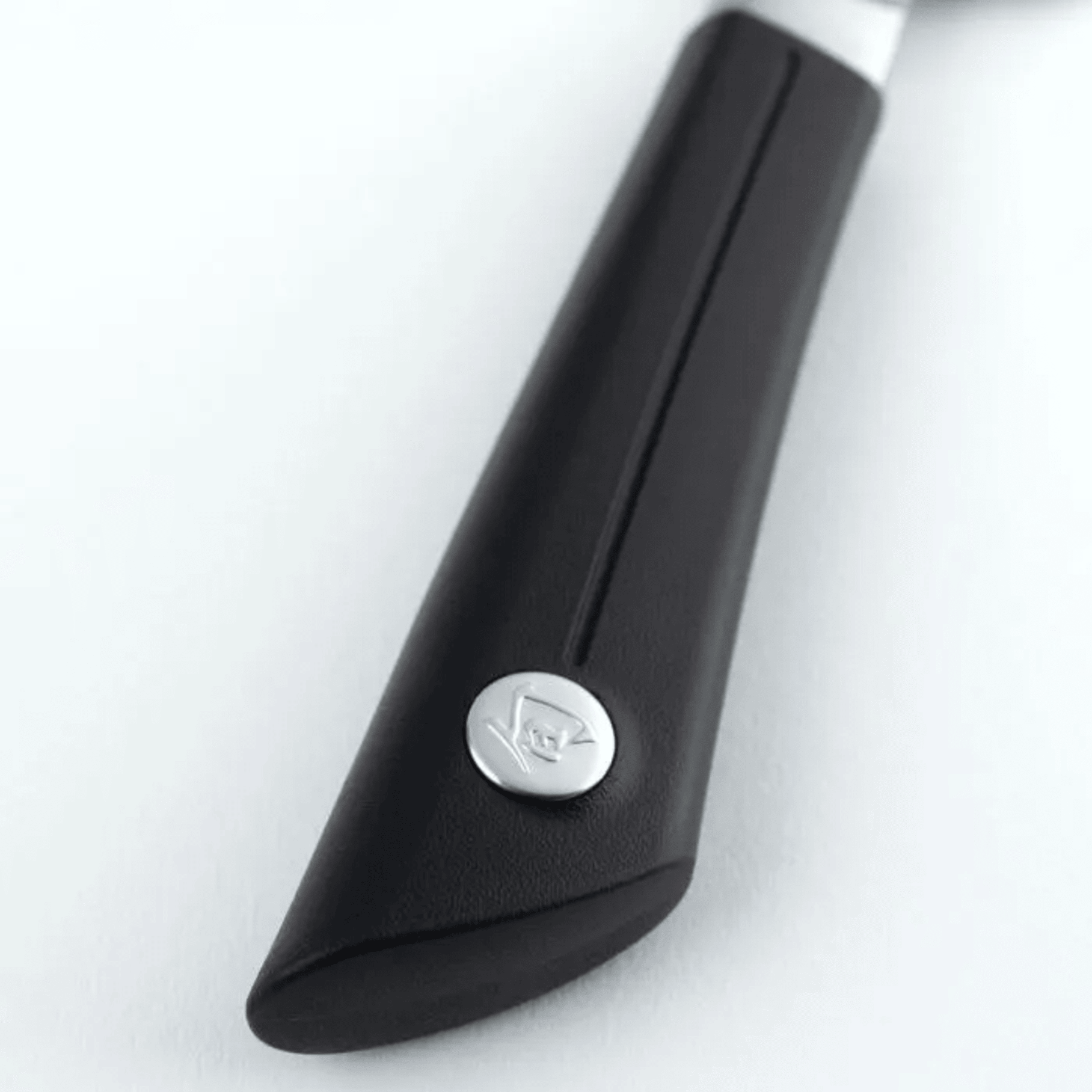 A santoku is an Asian-inspired knife that is versatile and can handle basic kitchen cutting tasks. The Shun Sora Hollow Ground Santoku is slightly shorter than a standard chef’s knife, light, agile, and easy to maneuver. It has a slight belly curve for rocking cuts and hollow-ground indentations on the blade to reduce friction and make cutting easier.