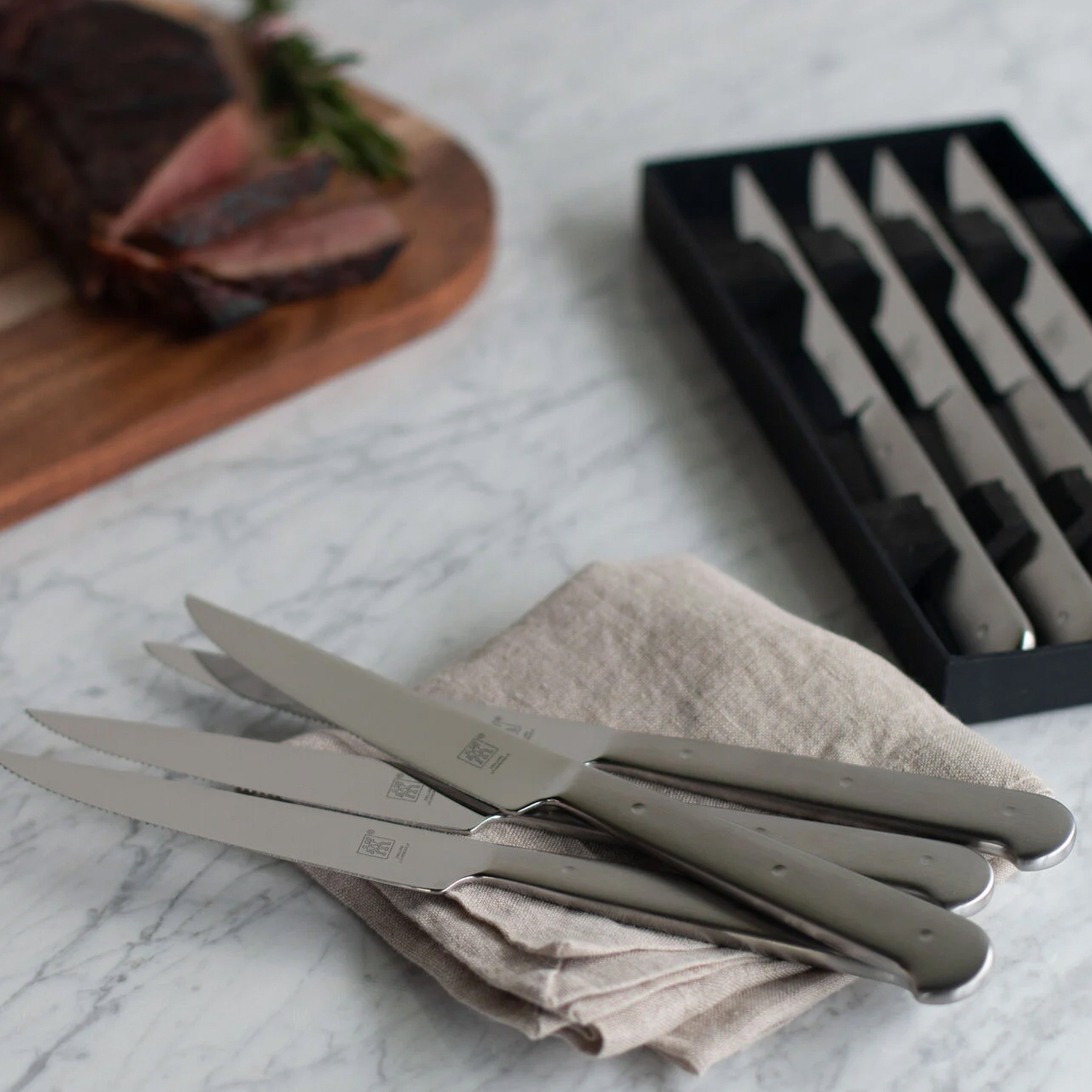 This beautiful steak knife set comes in an elegantly presented box that is perfect for a gift. Made from a single piece of stainless steel, it has a strong blade with a long-lasting sharpness that can cut through even the thickest pieces of meat.