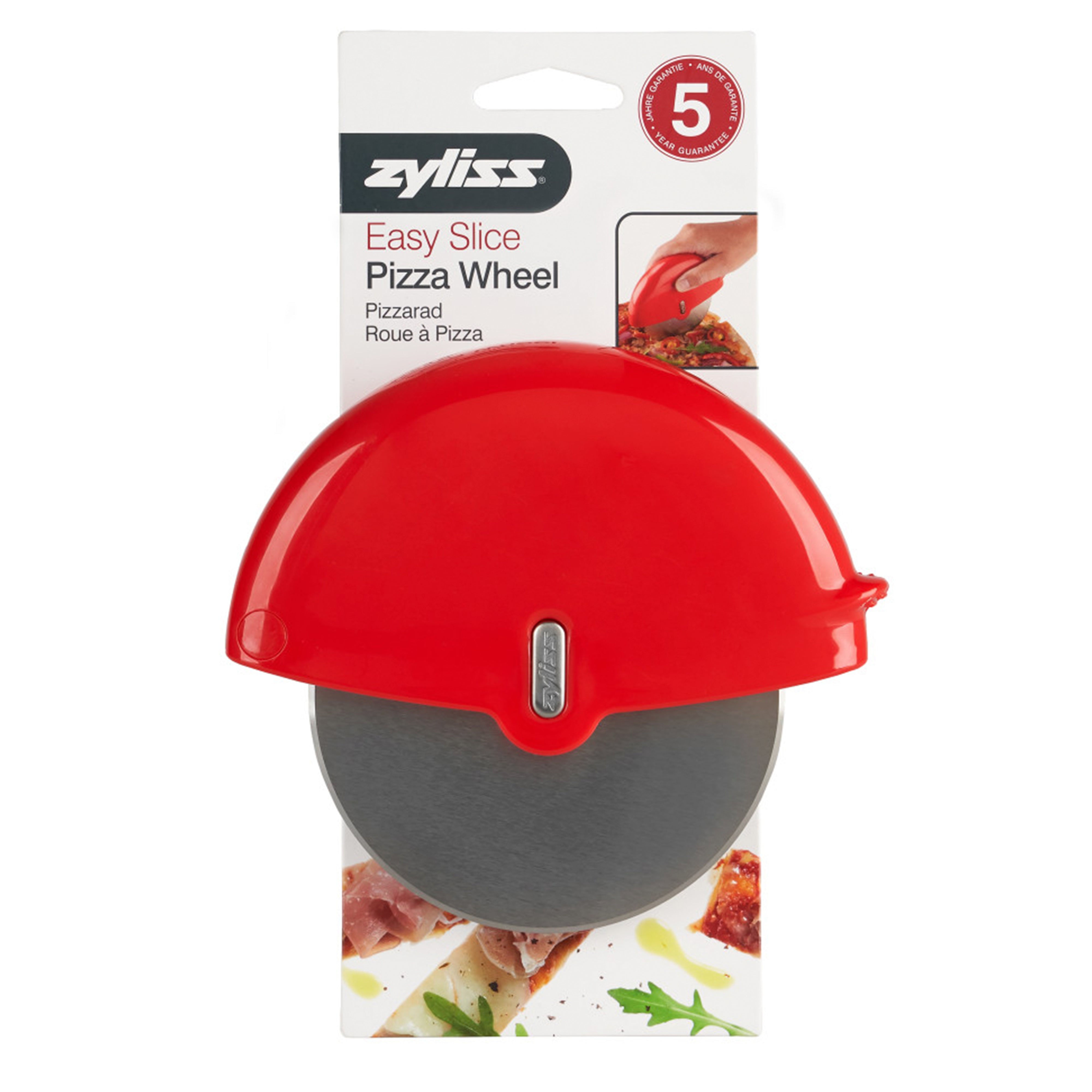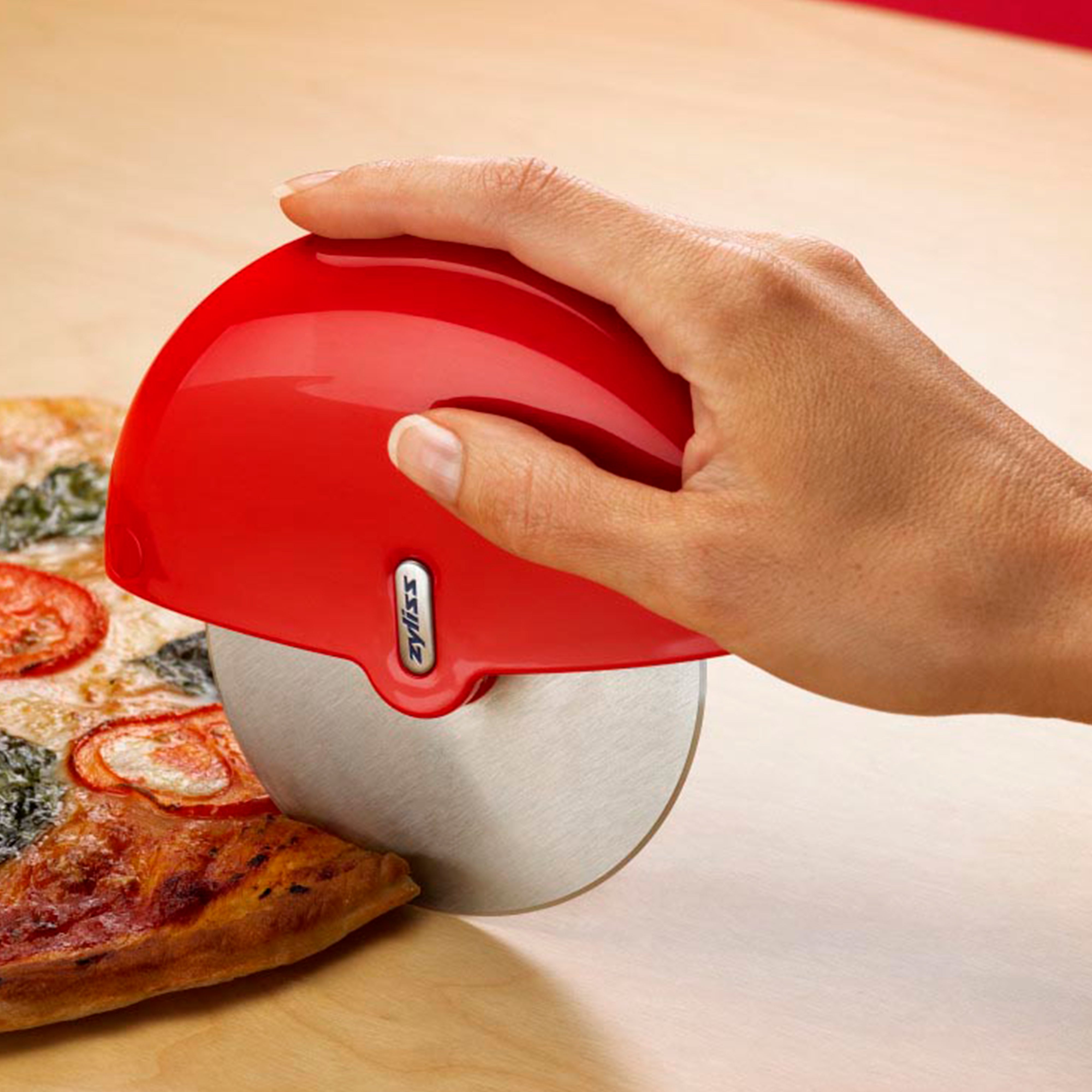 - Handheld pizza wheel smoothly slices through even thick-crusted pizza